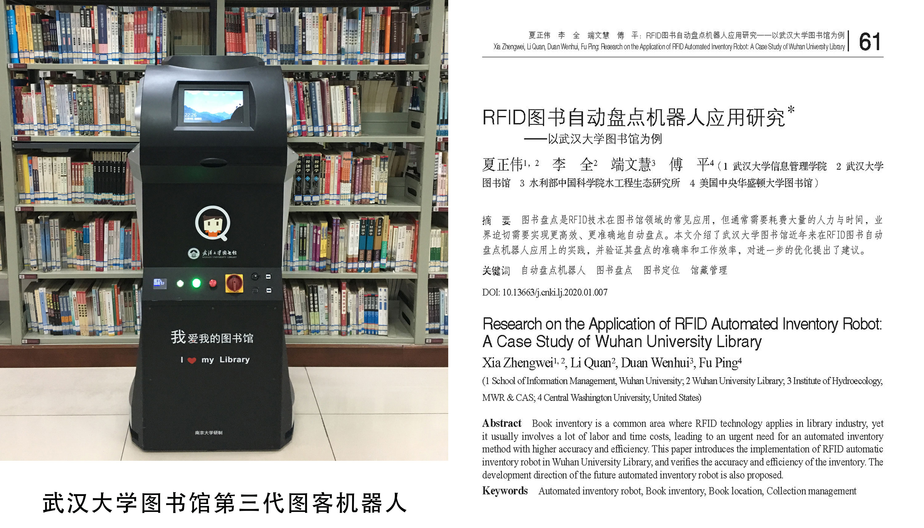 近日,来自武汉大学图书馆的研究人员夏正伟、李全、端文慧、傅平在全国性图书馆学情报学专业核心期刊《图书馆杂志》上发表了一篇名为《RFID图书自动盘点机器人应用研究——以武汉大学图书馆为例》的论文,详尽介绍了武汉大学图书馆近年来在RFID图书自动盘点机器人应用上的实践成果。